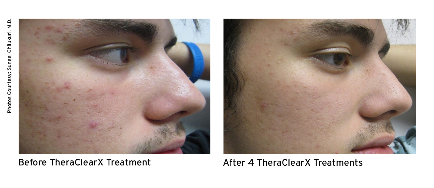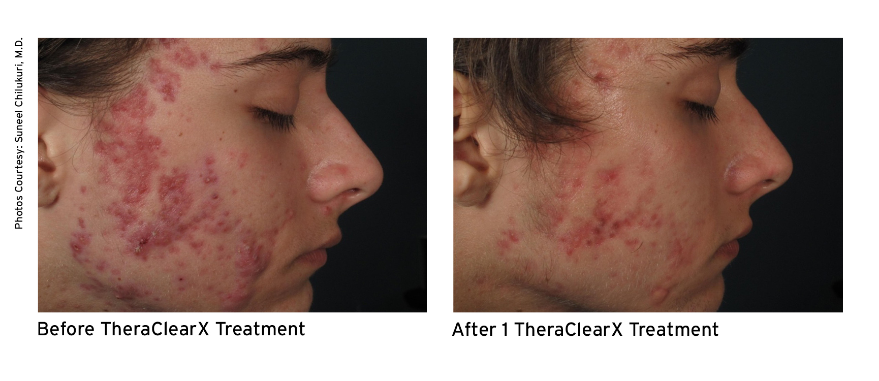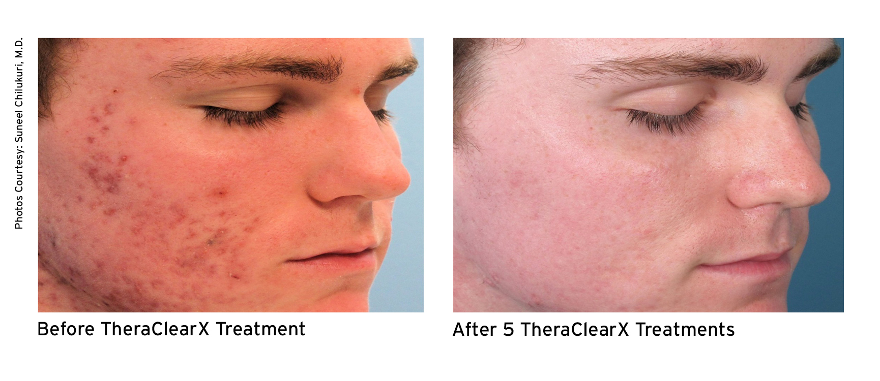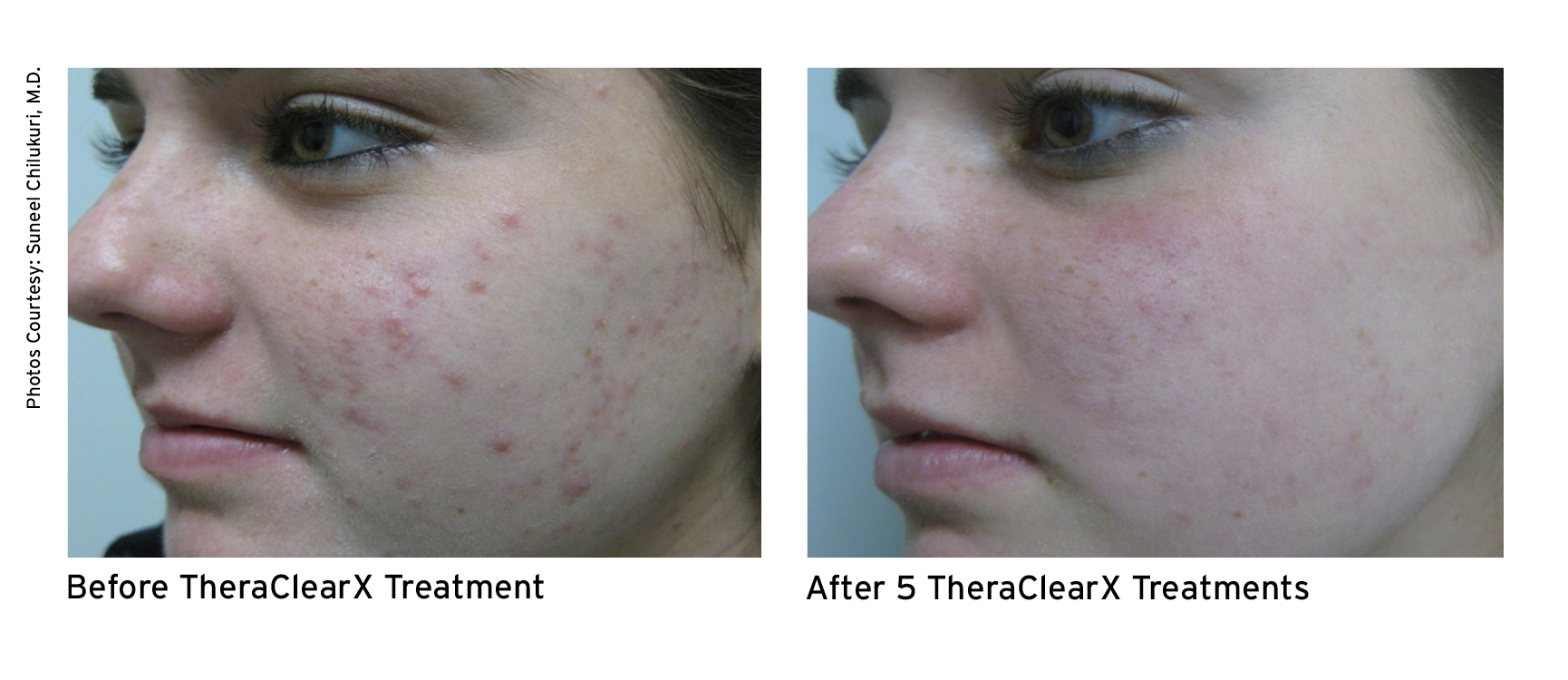 TheraClearX is a noninvasive, in-office acne treatment system. It is engineered and FDA-cleared for the treatment of mild-to-moderate acne, including comedonal, pustular, and inflammatory acne vulgaris. TheraClearX combines vacuum + broadband light technology that is delivered through a liquid-cooled, handheld delivery system.